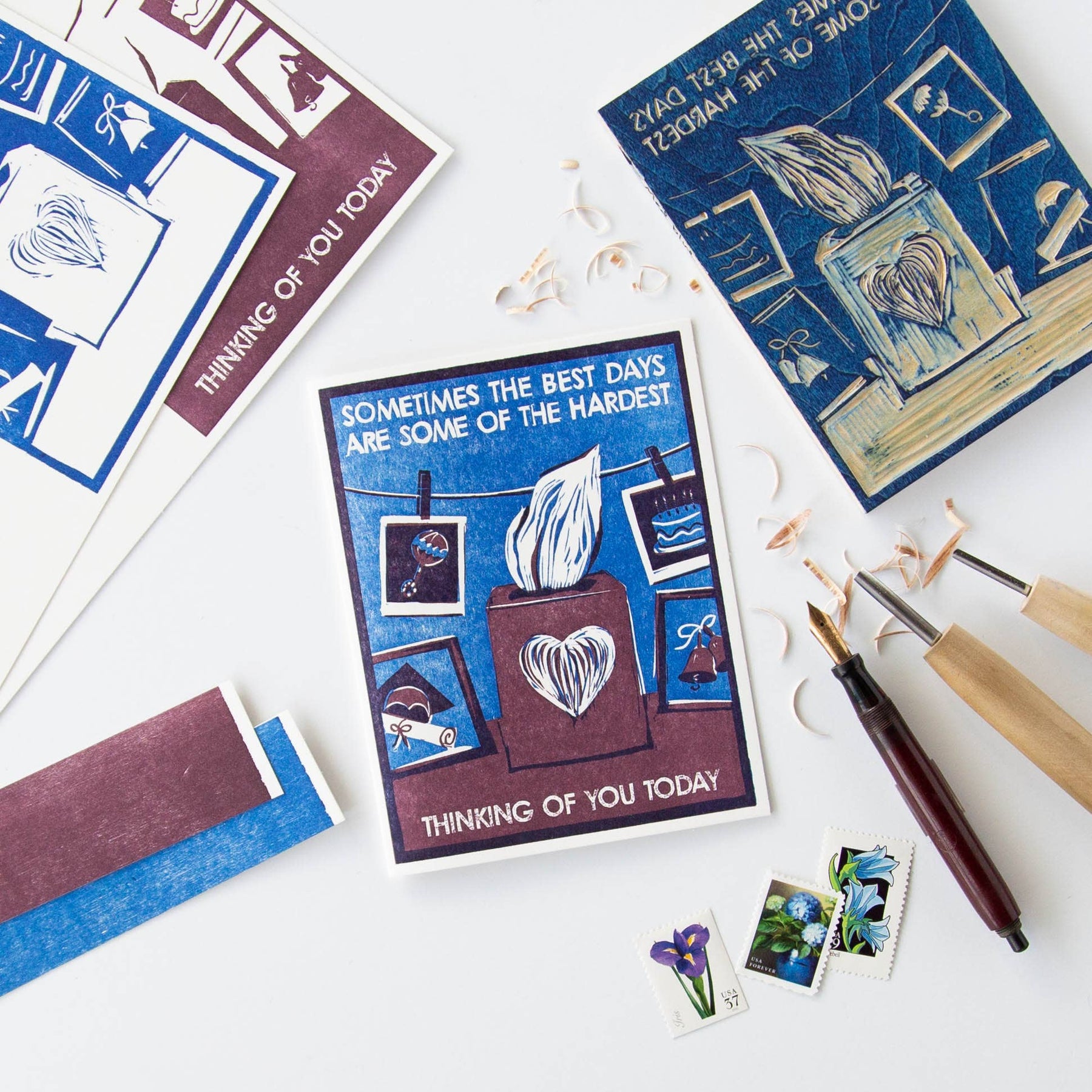 Letterpress, 100% post-consumer recycled paper, A2, blank inside, cello sleeve with envelope.