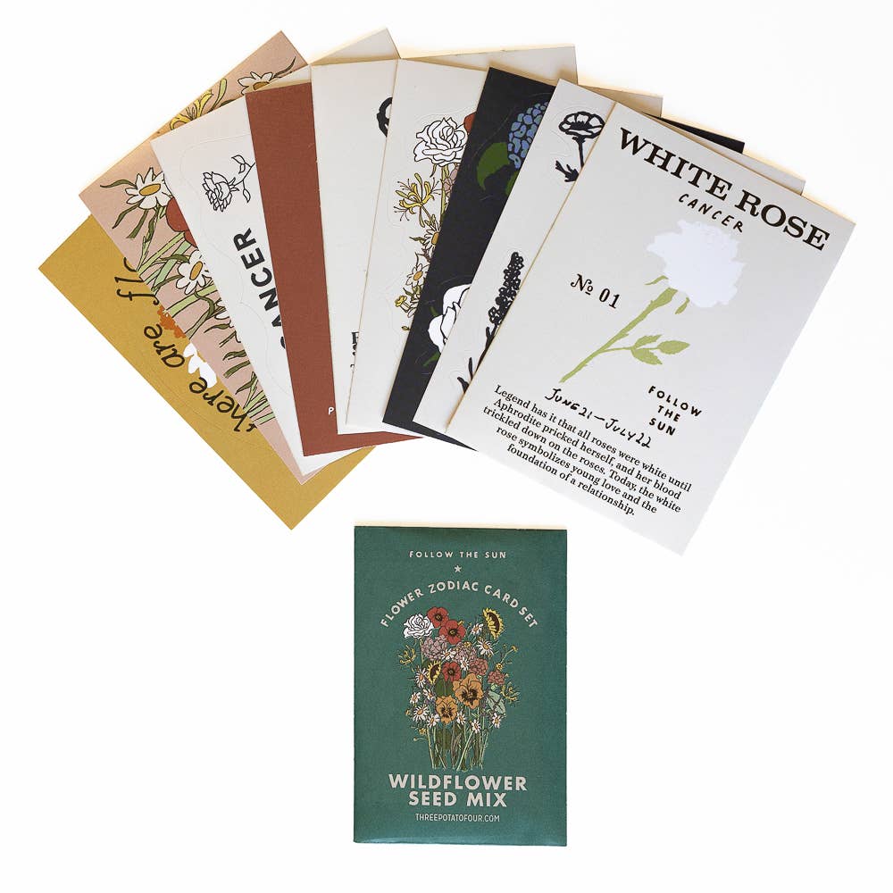 Follow The Sun! Inspired by vintage collectible trading card sets, our Flower Zodiac Sticker Card Sets explore the beauty of flowers reflected in the starry night skies above. Vibrant illustrations and insightful info on each sticker card. Don’t just open it and put it in that never ending junk drawer. Use them as stickers and put them anywhere! Plus, each pack comes with a wildflower seed packet and secret puzzle (assembled using the card backs). Perfect birthday or holiday gift with a “to” and “from” fill-in section already added on the back of each pack. Cancer Flower Zodiac Sticker Card Set. (June 21 - July 22) Contains 9 Sticker Cards + Secret Puzzle + Seed Pack. -Great gift -3.5” x 2.5” -Quick Ship