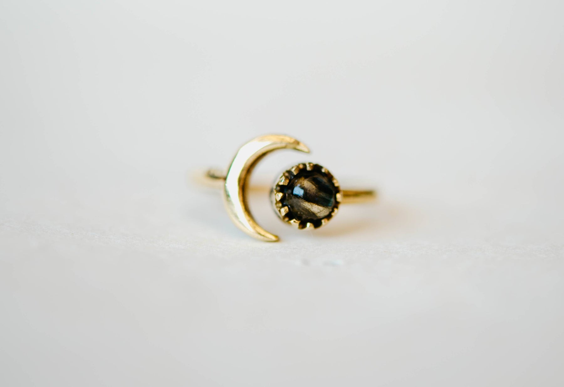 Gemstone Sun and Crescent Moon Ring - Polished Brass ring with Natural Gemstone - Adjustable opening to size to your finger too much bending will cause the metal to break. - Handmade in India, assembled at the Bella Vita Studio in Downtown Little Rock, Arkansas - Ref: rings for women, ring display, jewelry display, southern maker, gold jewelry, boho jewelry, handmade made in usa, unique gifts for women, accessories, gemstone ring, gemstone rings, crystals and stones, crystal, natural stone, beads, charms, metaphysical, natural life, self care, vintage inspired, delicate jewelry, moons, celestial, spiritual, birthstone jewelry, turquoise jewelry, mermaid, beach, nautical, barbie, vintage halloween, witchy, spooky witch, hocus pocus, wicked, spring 2025, summer, fall, winter, autumn, christmas gifts, vintage christmas gift, easter basket, mothers day gifts, jewelry for mom, graduation gifts, valentines day gifts, mother's day gift, stocking stuffers for women