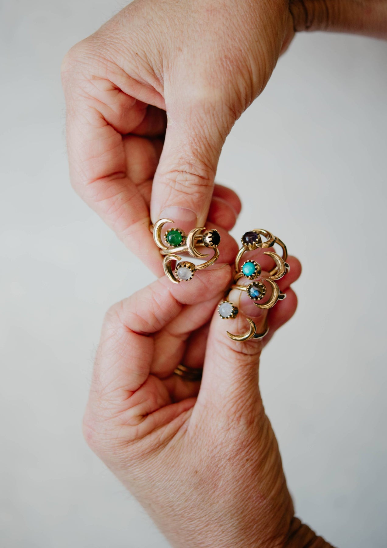 Gemstone Sun and Crescent Moon Ring - Polished Brass ring with Natural Gemstone - Adjustable opening to size to your finger too much bending will cause the metal to break. - Handmade in India, assembled at the Bella Vita Studio in Downtown Little Rock, Arkansas - Ref: rings for women, ring display, jewelry display, southern maker, gold jewelry, boho jewelry, handmade made in usa, unique gifts for women, accessories, gemstone ring, gemstone rings, crystals and stones, crystal, natural stone, beads, charms, metaphysical, natural life, self care, vintage inspired, delicate jewelry, moons, celestial, spiritual, birthstone jewelry, turquoise jewelry, mermaid, beach, nautical, barbie, vintage halloween, witchy, spooky witch, hocus pocus, wicked, spring 2025, summer, fall, winter, autumn, christmas gifts, vintage christmas gift, easter basket, mothers day gifts, jewelry for mom, graduation gifts, valentines day gifts, mother's day gift, stocking stuffers for women