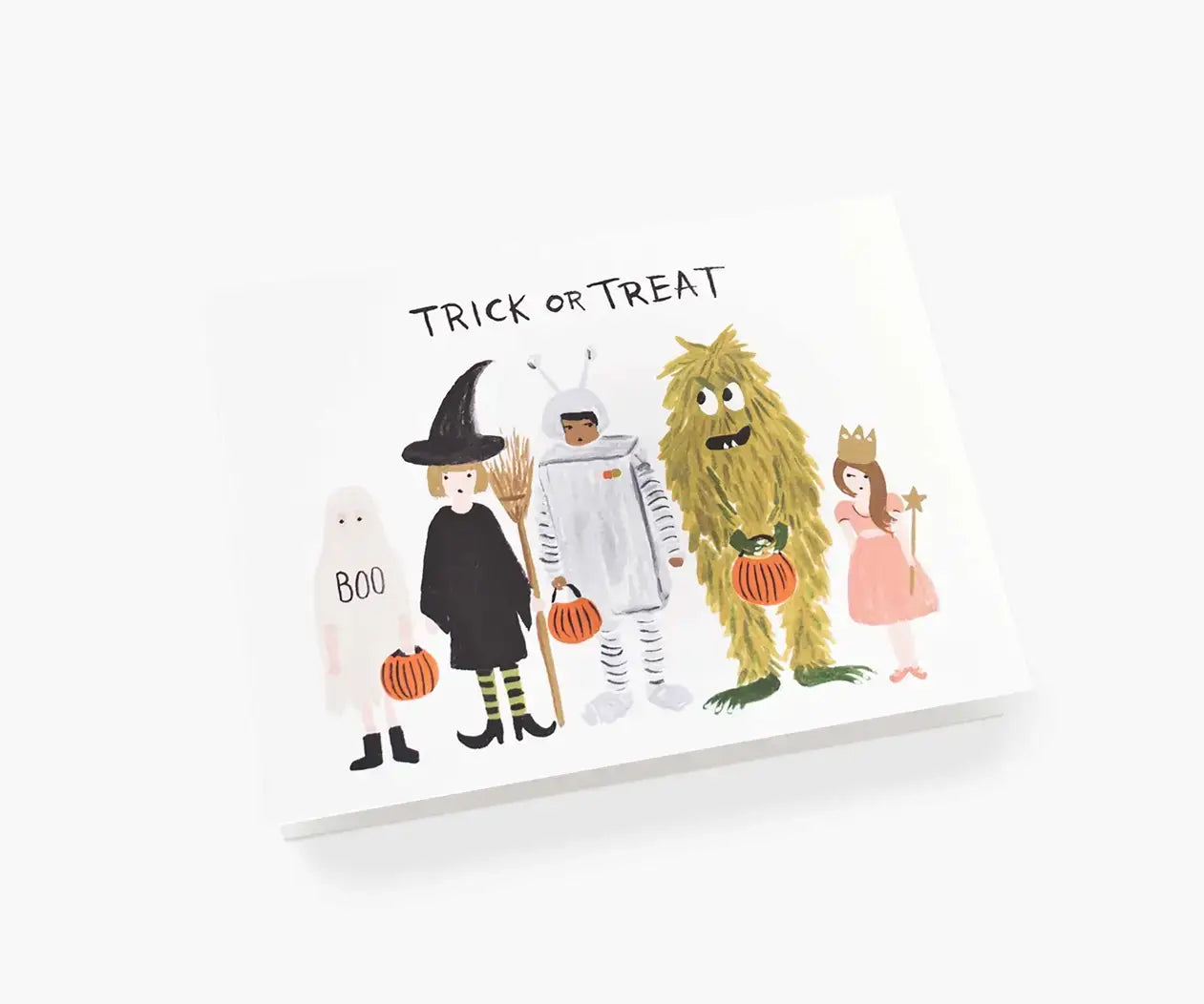 Wish friends and family a happy Halloween with our festive greeting cards. A blank interior lets your handwritten note take center stage. DETAILS - 4.25" L × 5.5" W - Natural white cover paper - Printed in full color - Soft white envelope - Blank interior - Made in USA