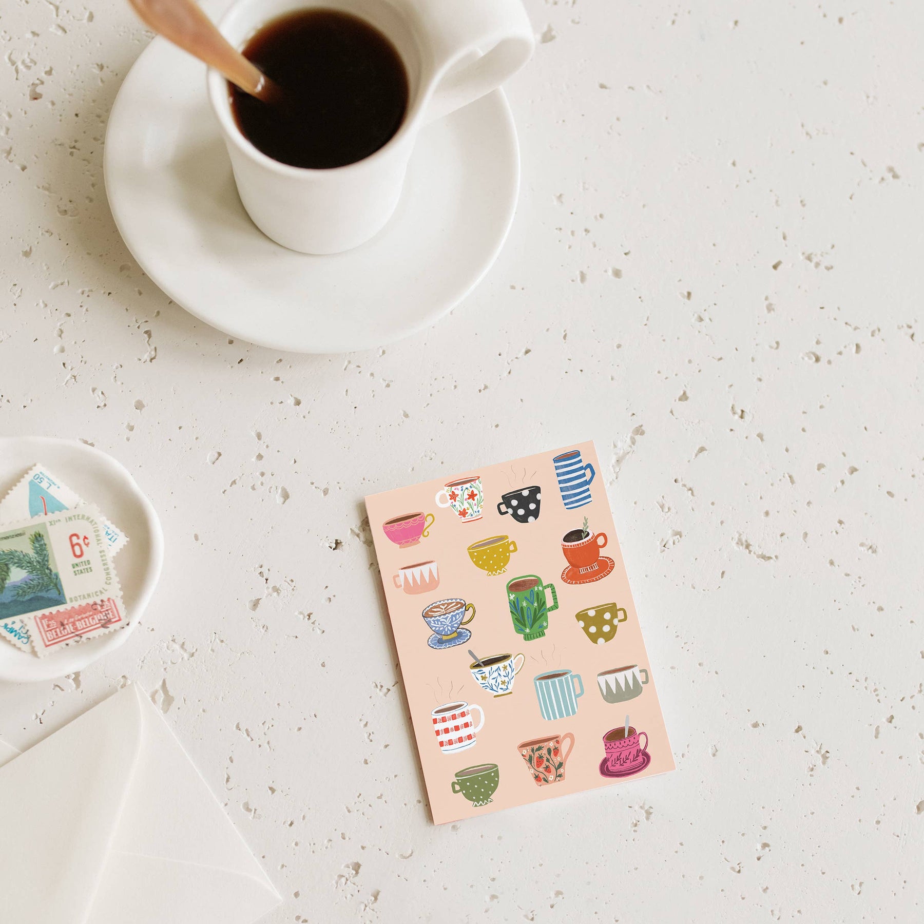 A thoughtful touch, perfectly sized. This mini card features a cozy lineup of illustrated mugs, making it an ideal pairing for a coffee gift card, a small treat, or a thoughtful little gesture. A charming way to share a warm note in a compact, petite format. Paper: Crisp white heavyweight paper | Envelope Color: pure white | Size: 3.5” x 2.5” | Printing Type: digital