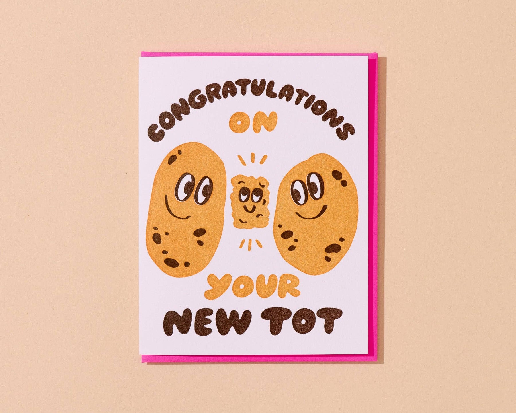 • Card reads, “Congratulations on your new tot" with illustration of two parent potatoes with a tater tot baby”