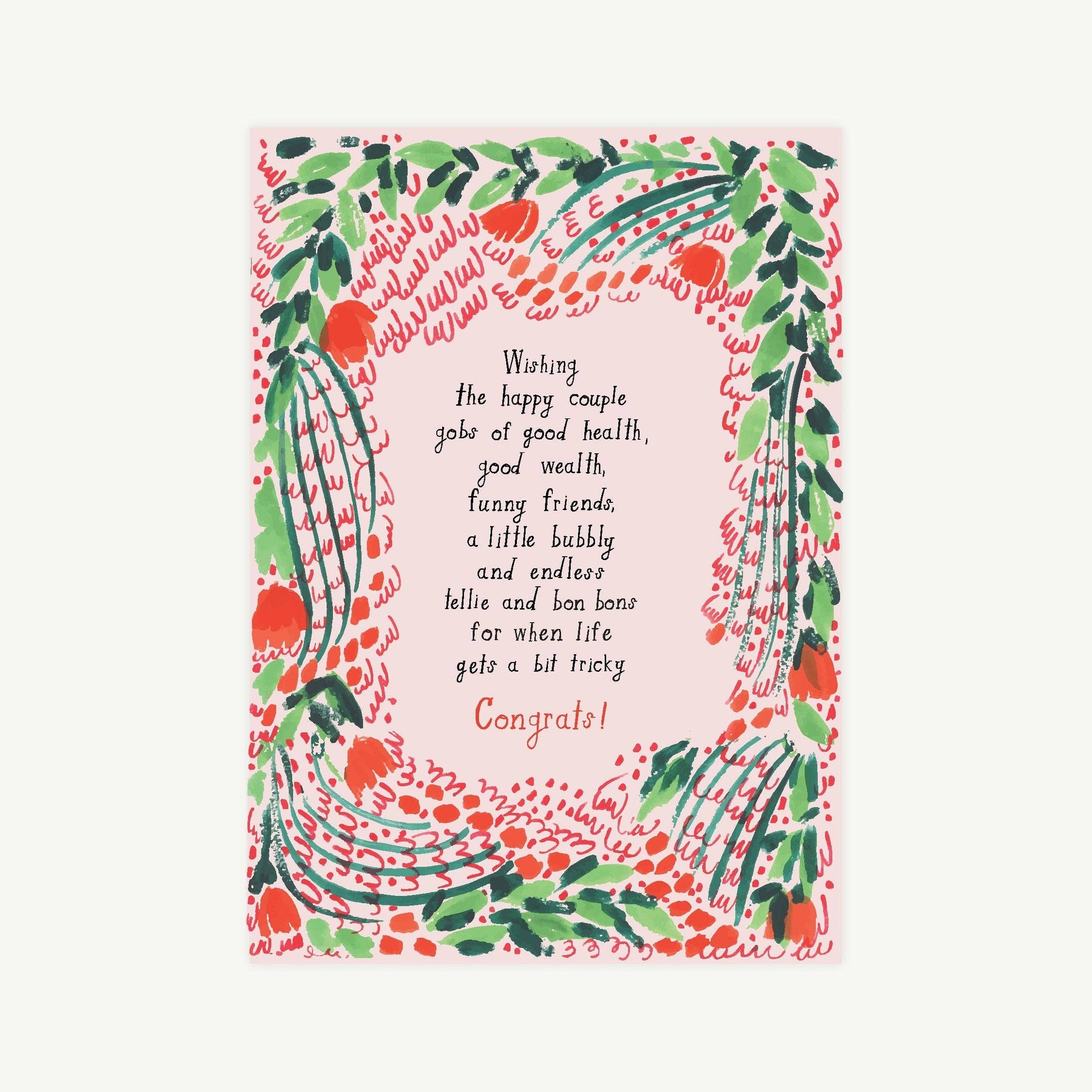 Hand-drawn illustration and typography Printed in the U.S.A. Folded A6 card measuring 4.5" x 6.25" Flat matte printed in brilliant hues Blank on the inside Colored envelope (color will most certainly vary!)