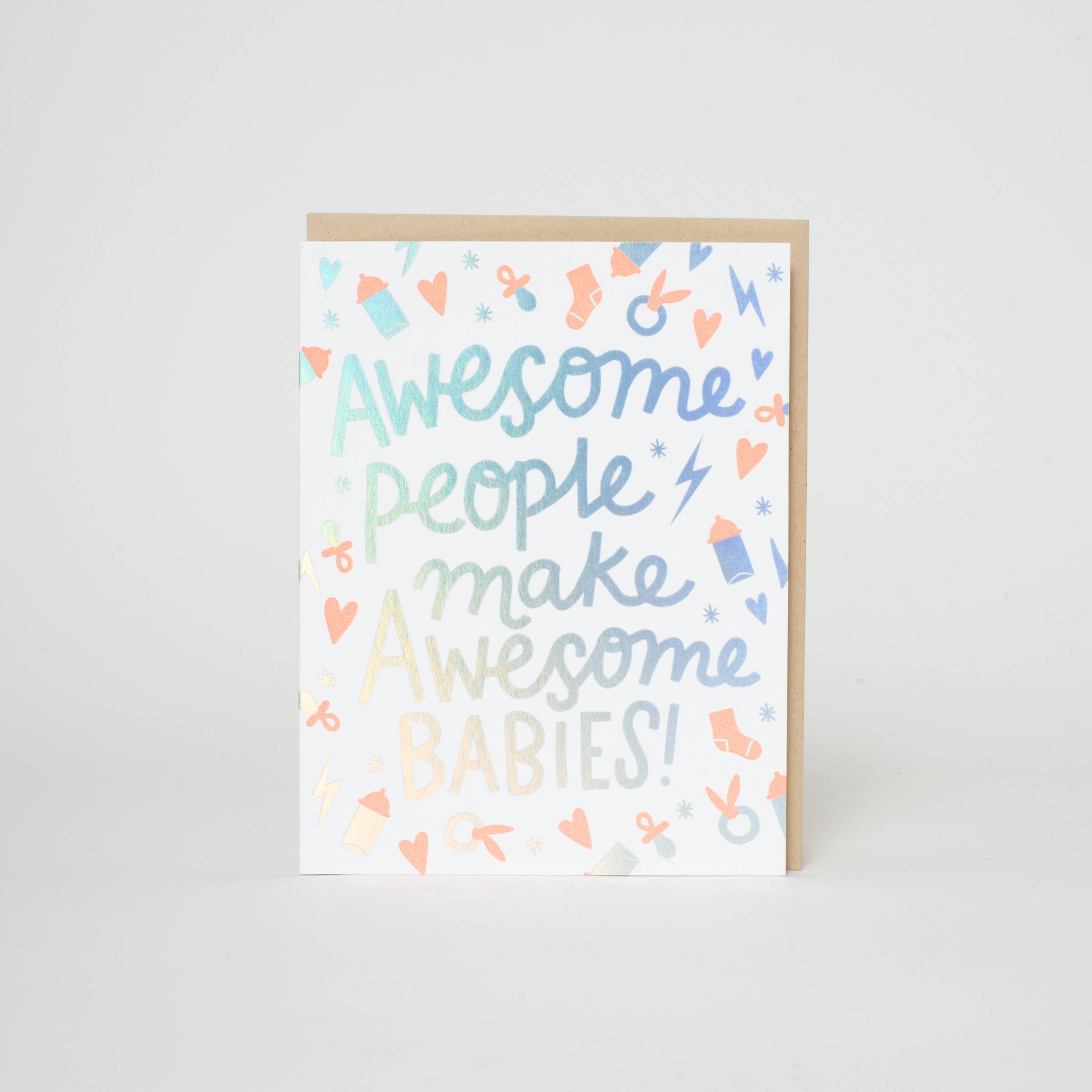 Cheer on the soon-to-be-parents! Holographic foil! We're EP.MFG, and we make nice cards. ☺ Letterpress printed by hand in Portland, Oregon. Shop cards from five incredible designers, all in one place. All about this card: -Comes with a kraft envelope. -Dimensions: A2 (4.25 x 5.5 inches). -Designed by Hello!Lucky in San Francisco, CA.
