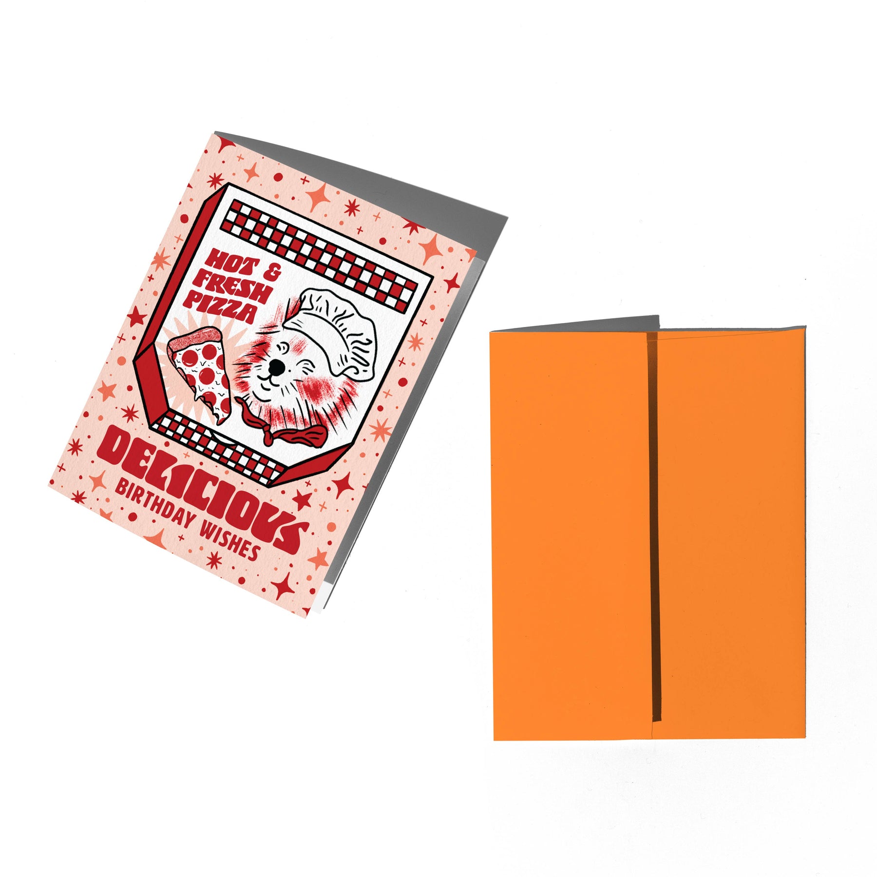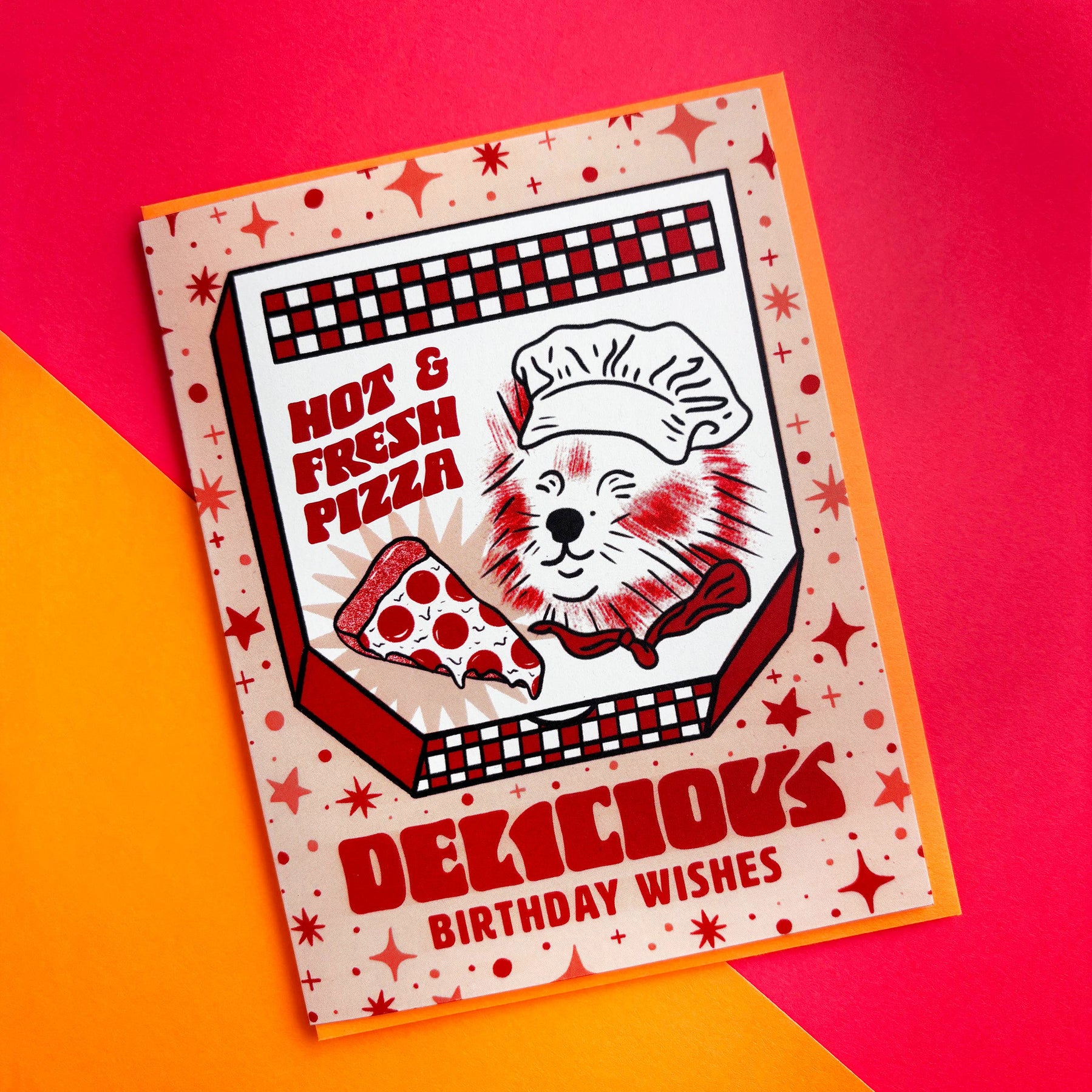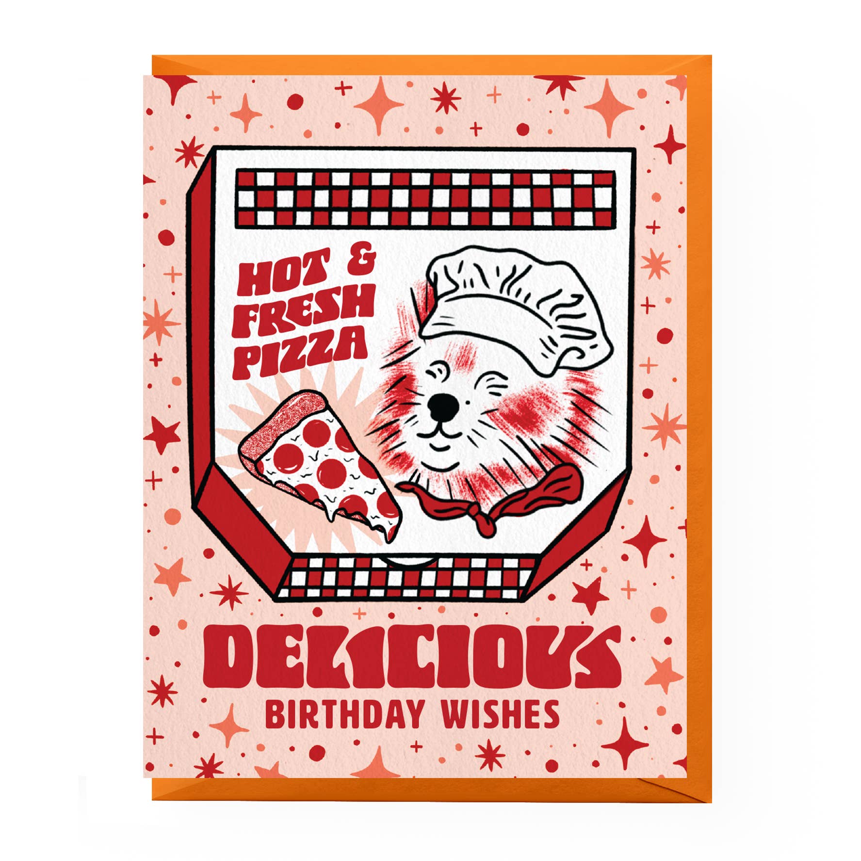 Celebrate your favorite pizza fan with a raccoon chef. Printed on 100% recycled paper and paired with a coordinating envelope. Blank inside and sealed in a protective cellophane sleeve. Size A2 (4.25" x 5.5"). Card reads "Delicious Birthday Wishes" and features an illustrated vintage pizza box adorned with a raccoon in a classic chef's hat.