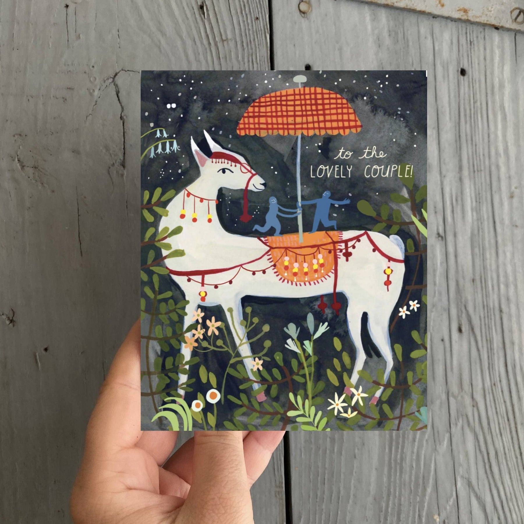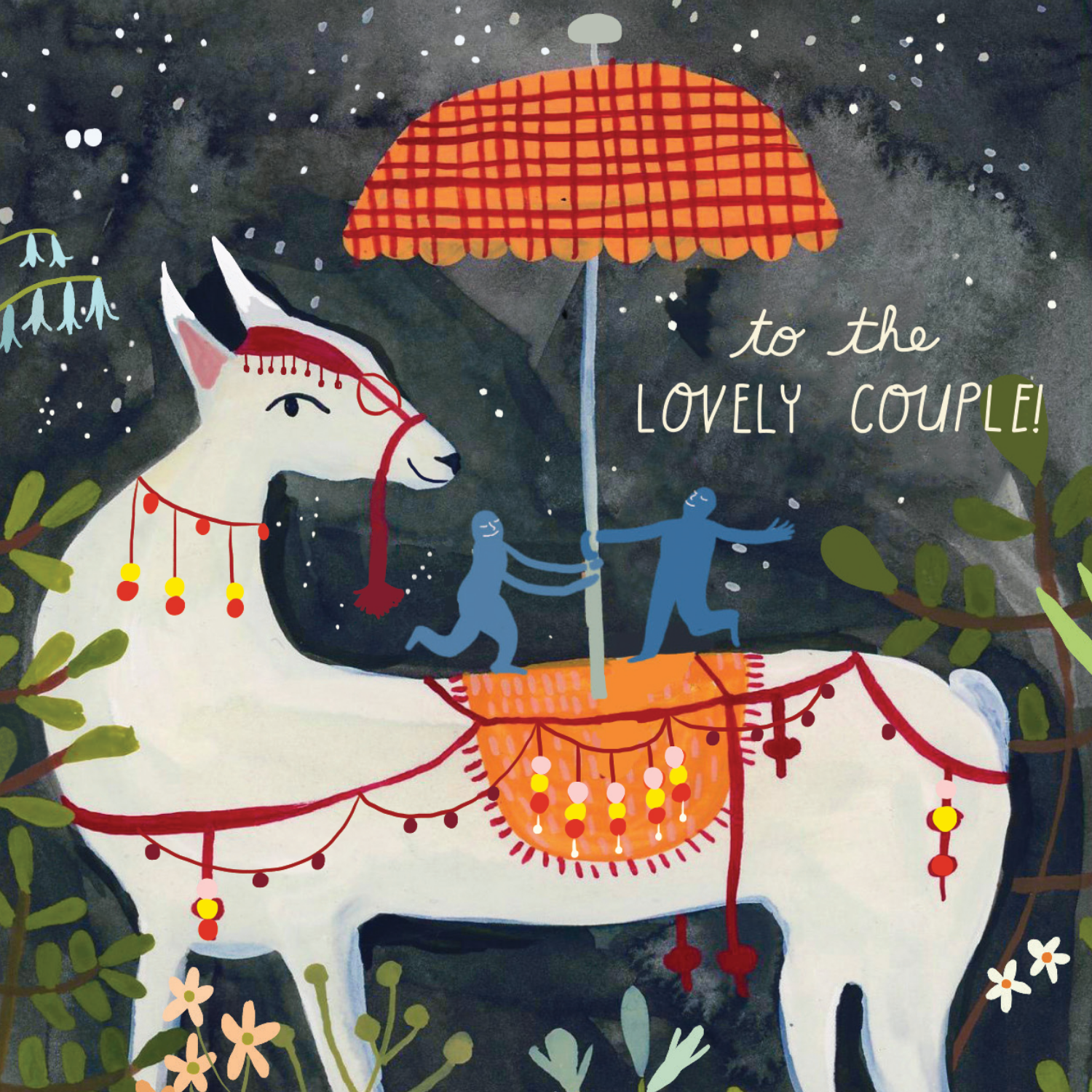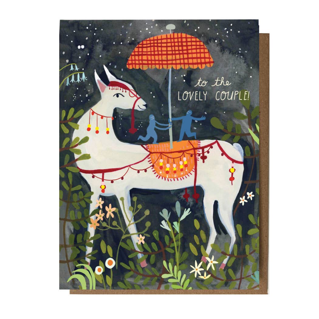 • 4.25" x 5.5” sleeved A2 card, blank inside and paired with a Kraft envelope. • Printed responsibly in the United States on 100# vellum with post-consumer recycled paper. • Illustrated by beloved Children’s book illustrator Esmé Shapiro. A charming multicolored greeting card featuring two dancers under an umbrella on the back of an adorned llama standing in a field of flowers under a night sky, text reads "To The Lovely Couple."