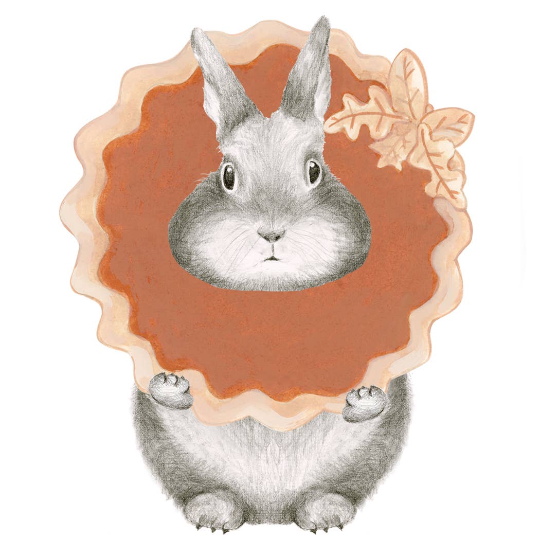 Hand drawn Bunny with a painted pumpkin pie text reads "There's always Pumpkin to be Thankful for". Details: Size A2 (4 ¼" x 5 ½") Printed on soft white paper and paired with a matching soft white envelope. Blank interior for personal message
